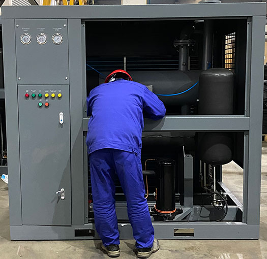 风冷型冷冻式干燥机必须安置在室内,并具有良好的通气设备以维持冷冻式干燥机的正常工作。安装在空压房内的风冷冷冻式干燥机,要采取冷冻式干燥机与空压机的隔热措施。