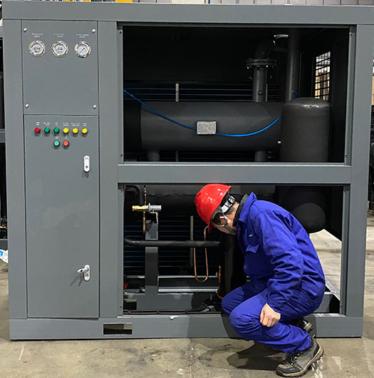 冬天环境温度低时,则应先开机器再打开冷却水进出阀门,严禁压缩空气倒流反吹,否则会损坏蒸发器。