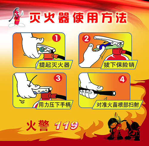 首先拔下保险销,将喷枪对准火焰根部,然后用力按下压把,阀门开启,干粉或泡沫即从喷管喷枪喷出灭火。