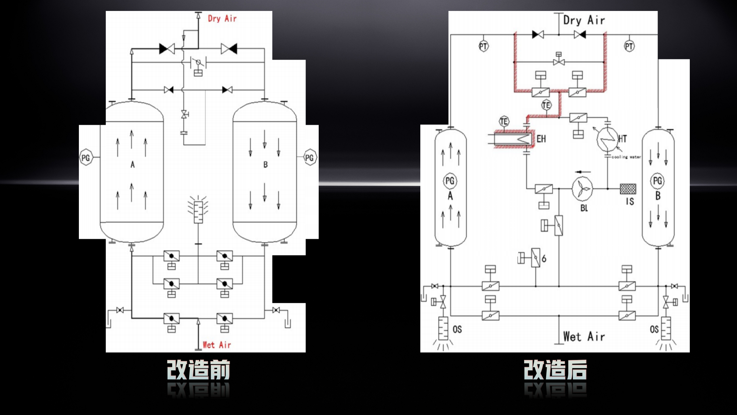 据了解,原设备为同行厂家 150 立方无热再生吸附式干燥机,我司经深入现场工况分析,创新提出‘零气耗鼓风热再生吸附式干燥机改造方案’