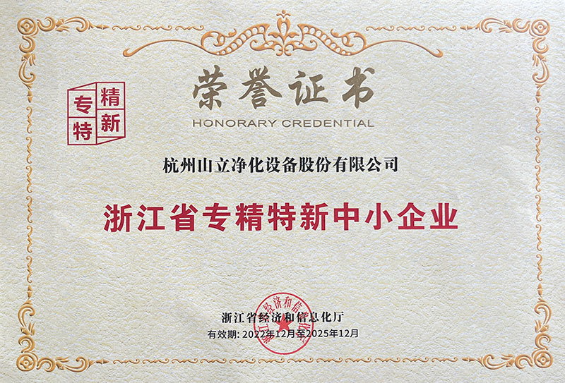 2023年,杭州yl23411永利官网登录被浙江省经济和信息化厅评定为浙江省“专精特新”中小企业。此次被认定为浙江省“专精特新”中小企业,该称号是对杭州yl23411永利官网登录净化技术创新、产品服务、经营发展及综合实力等方面的认可和肯定。