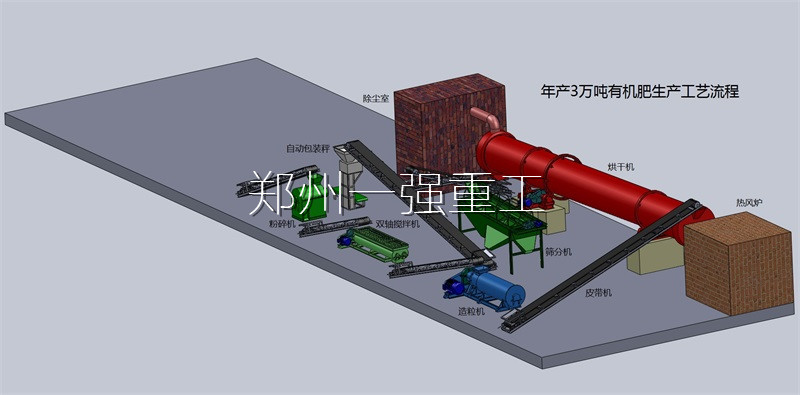年产三万吨有机肥生产线包括:翻堆机也称发酵机、粉碎机、造粒机、烘干机、筛粉机,如果有需要还要配制自动包装机等,这些设备一般是必不可少的,其实这些设备都有不同的配制参数,也有不同的规格,比如造粒机,有圆盘造粒机,也有新型的造粒机,其他设备也是同样如此,当然价格上也有区别,所以一切的一切,还是要根据您的具体情况来定,您需要什么样的,我们可以根据您的需求来私人订制不同的设备。