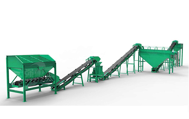 使用配料仓将堆肥后的物料和N、P、K等无机肥料及其他添加物等原料,按一定比例通过物料粉碎机和卧式混合机,进行粉碎、配比和混合。本系统作用是将堆肥后的物料和氮磷钾无机肥料及其他添加物等各种原料按一定比例进行粉碎、配比和混合。根据多年经验,设备配套建议如下:采用立式粉碎机粉碎鸡粪堆肥物不易粘壁,不易堵塞,多层紊流链锤结构改善粉碎性能;采用连续式自动配料系统适合有机肥原料的动态计量及配料控制;混合作业配置双轴连续式混合机,密封性好,粘湿物料不易在搅拌轴根部粘附。